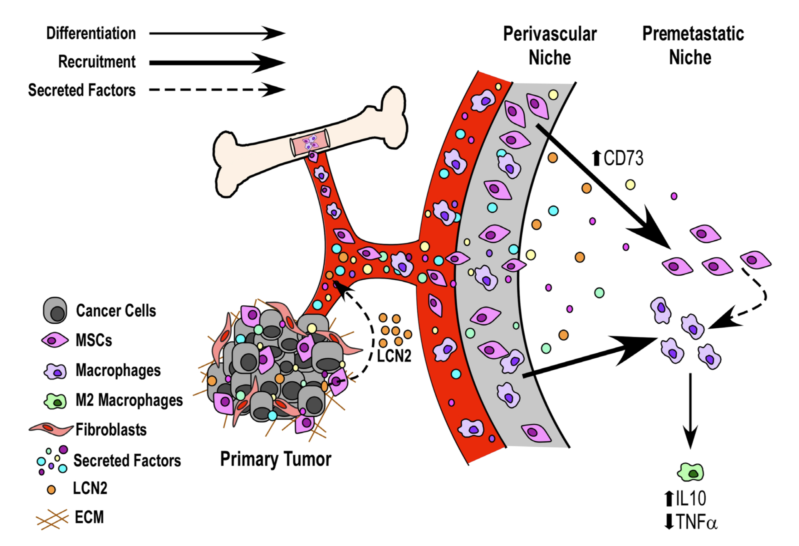 Image: Figure 5 from Meade et al. (2019), the authors’ model linking cancer cell secretions to changes in host tissue gene expression that create a more tumor-tolerant environment.
