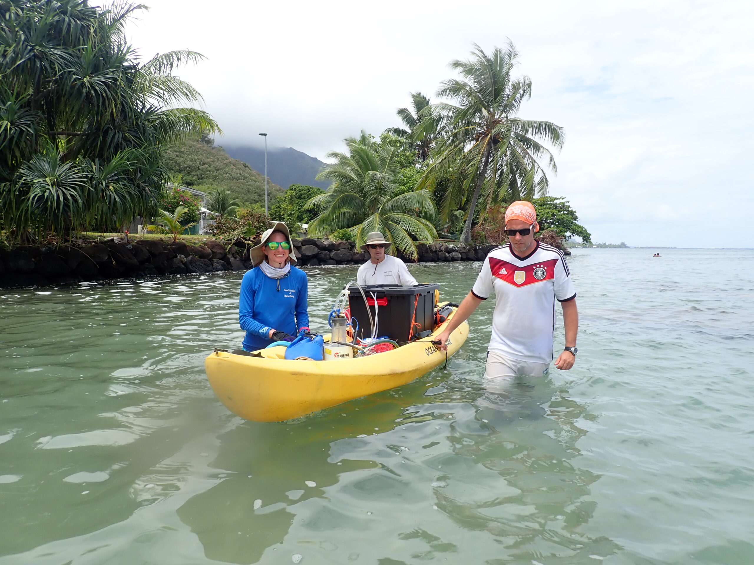 Image: Silbiger (left) and collaborators float equipment to a study site in Mo’orea (Photo via Nyssa Silbiger)
