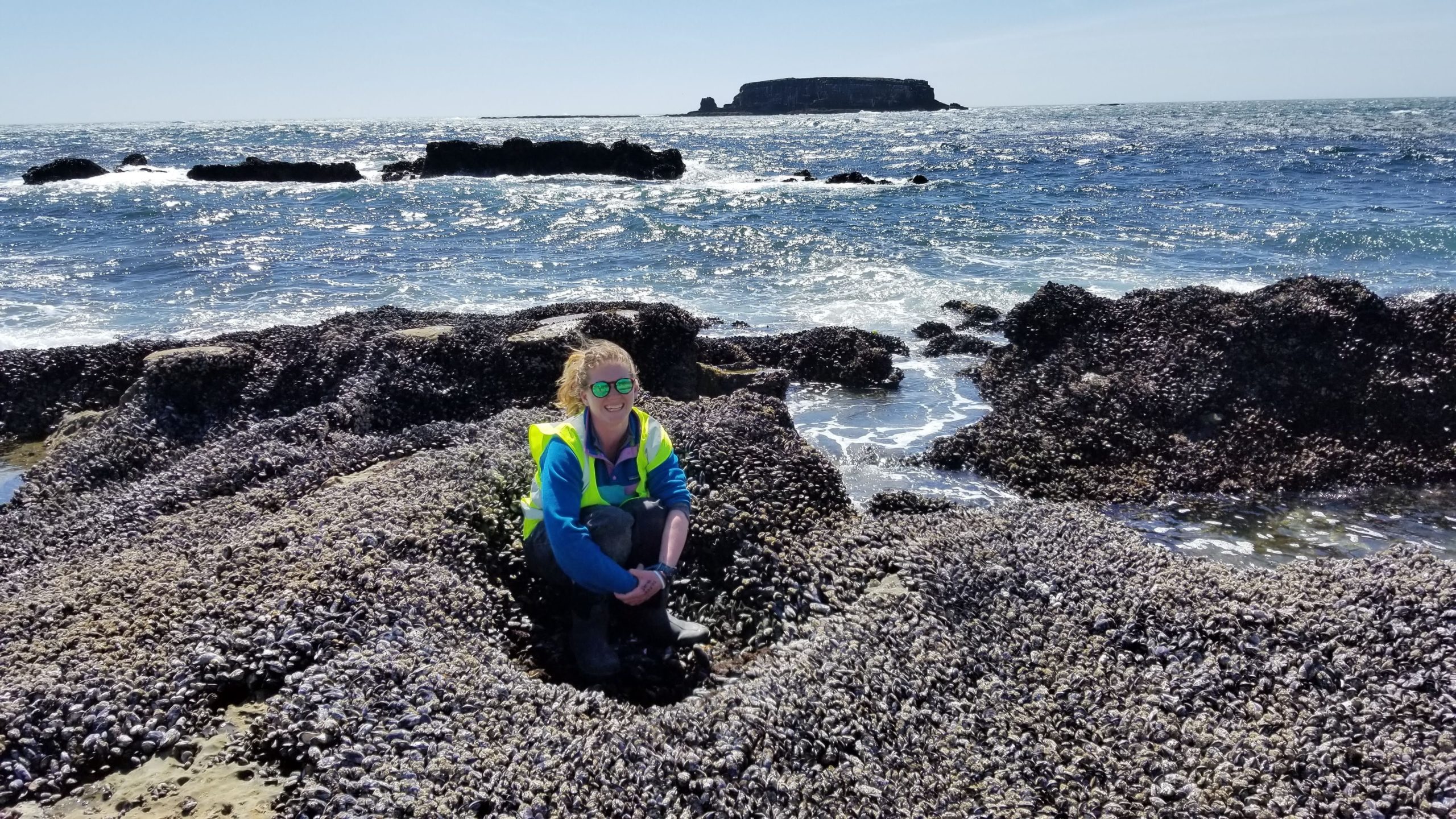 Header image: Jennifer Fields sits in the midst of a mussel bed at one of her field sites (Nyssa Silbiger)